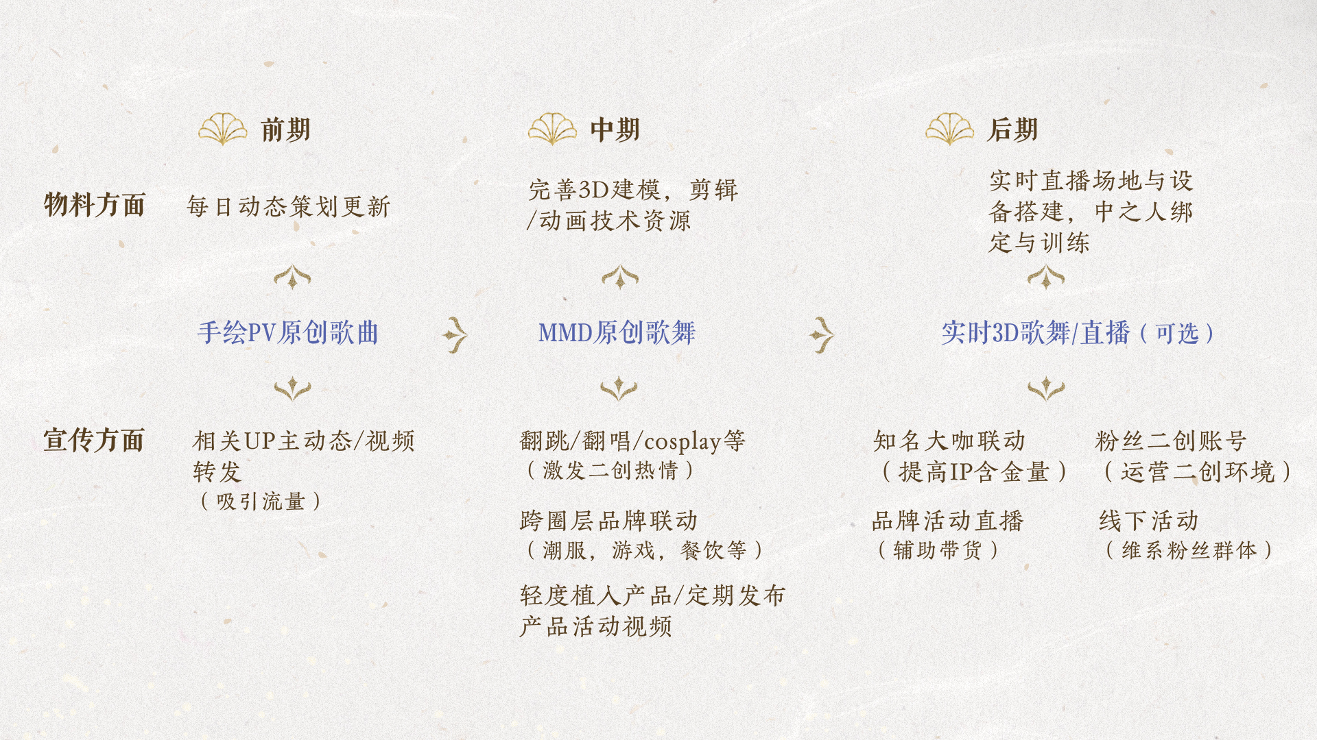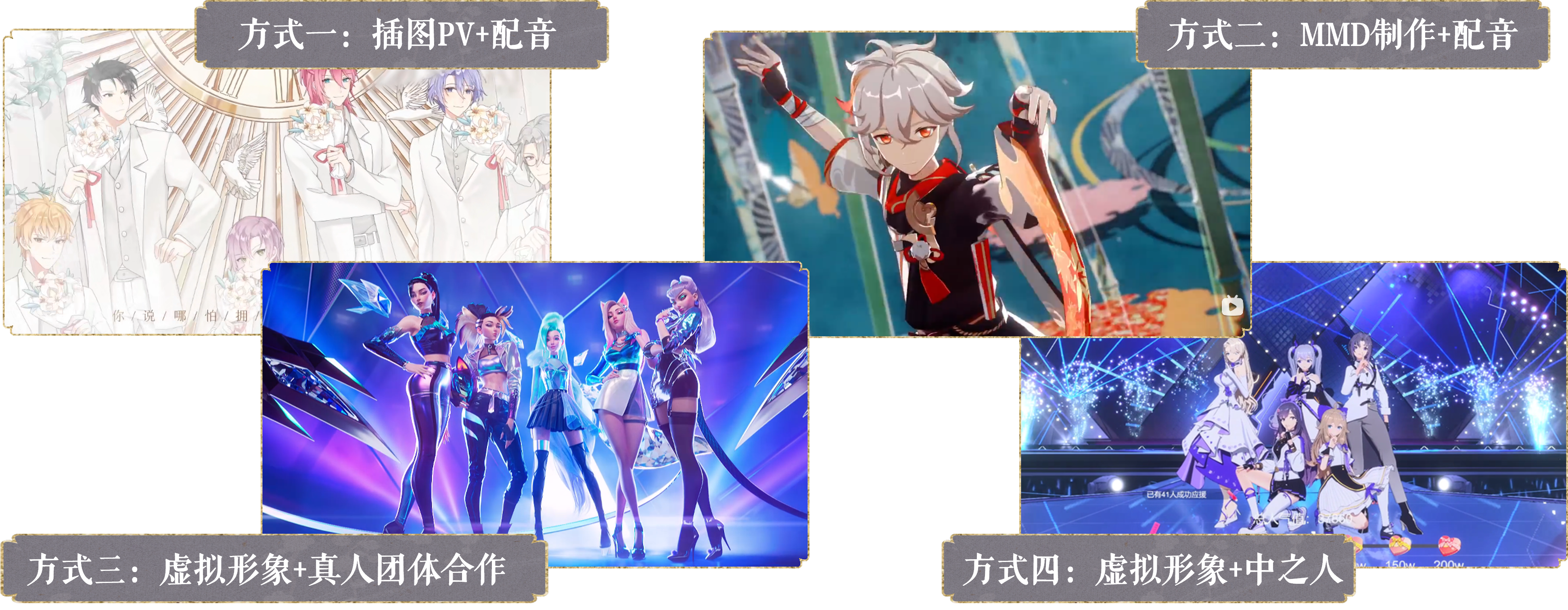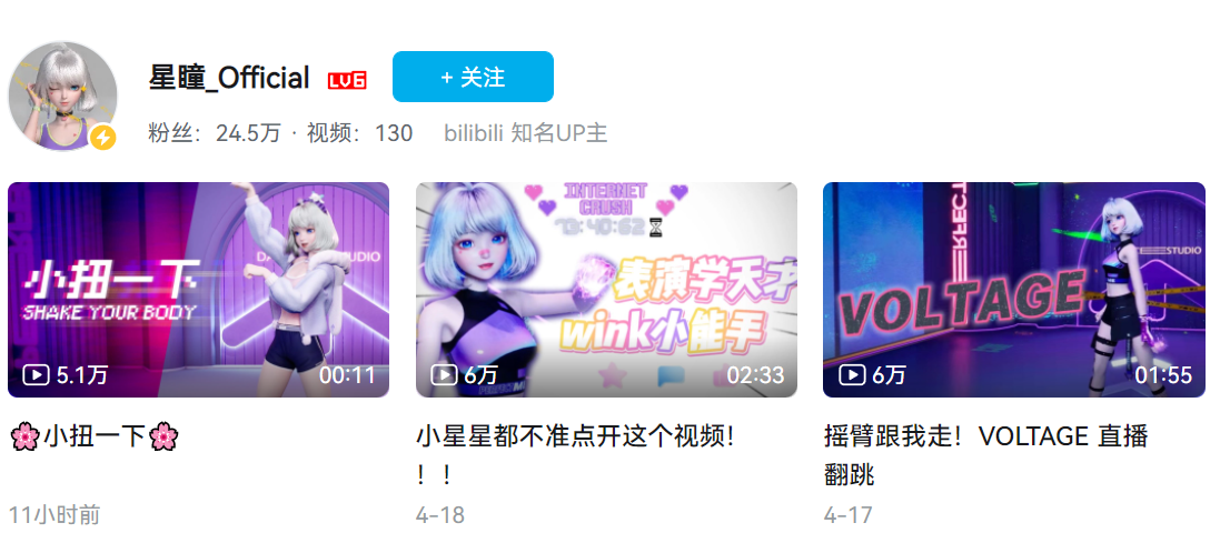 通过真人动捕3D建模与运镜,进行配音,制作原创组合/角色MV,发行“新歌”“新舞”吸粉。